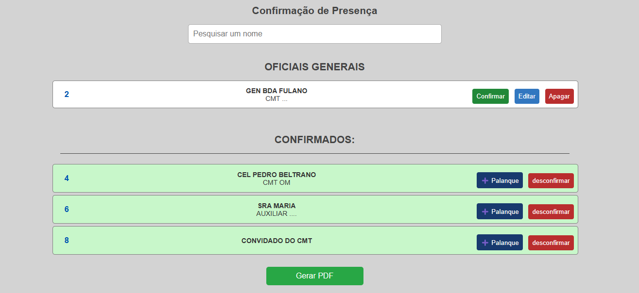 This app is a CRUD that provides a system for managing guests where you can create guests with name, function, type, order by antiquity, confirm presence and select which are the most important figures for reading on the ceremony. You can also search by name and generate PDF for printing.